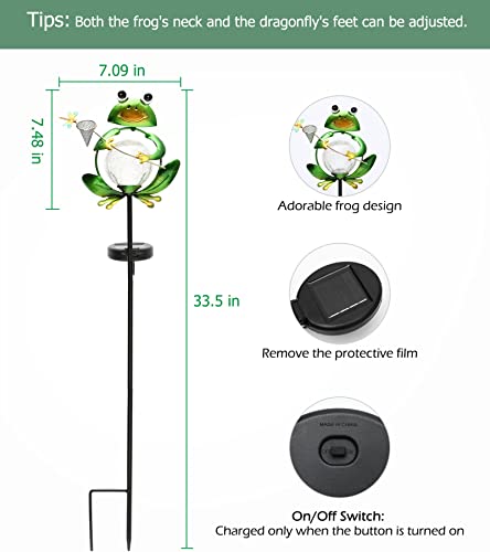 Unique Frog Shape Design: Adorable frog holding a net to catch dragonfly, plus the warm white solar cracked glass globe ball light. Whether it is day or night, it can make your garden more vivid and interesting.
